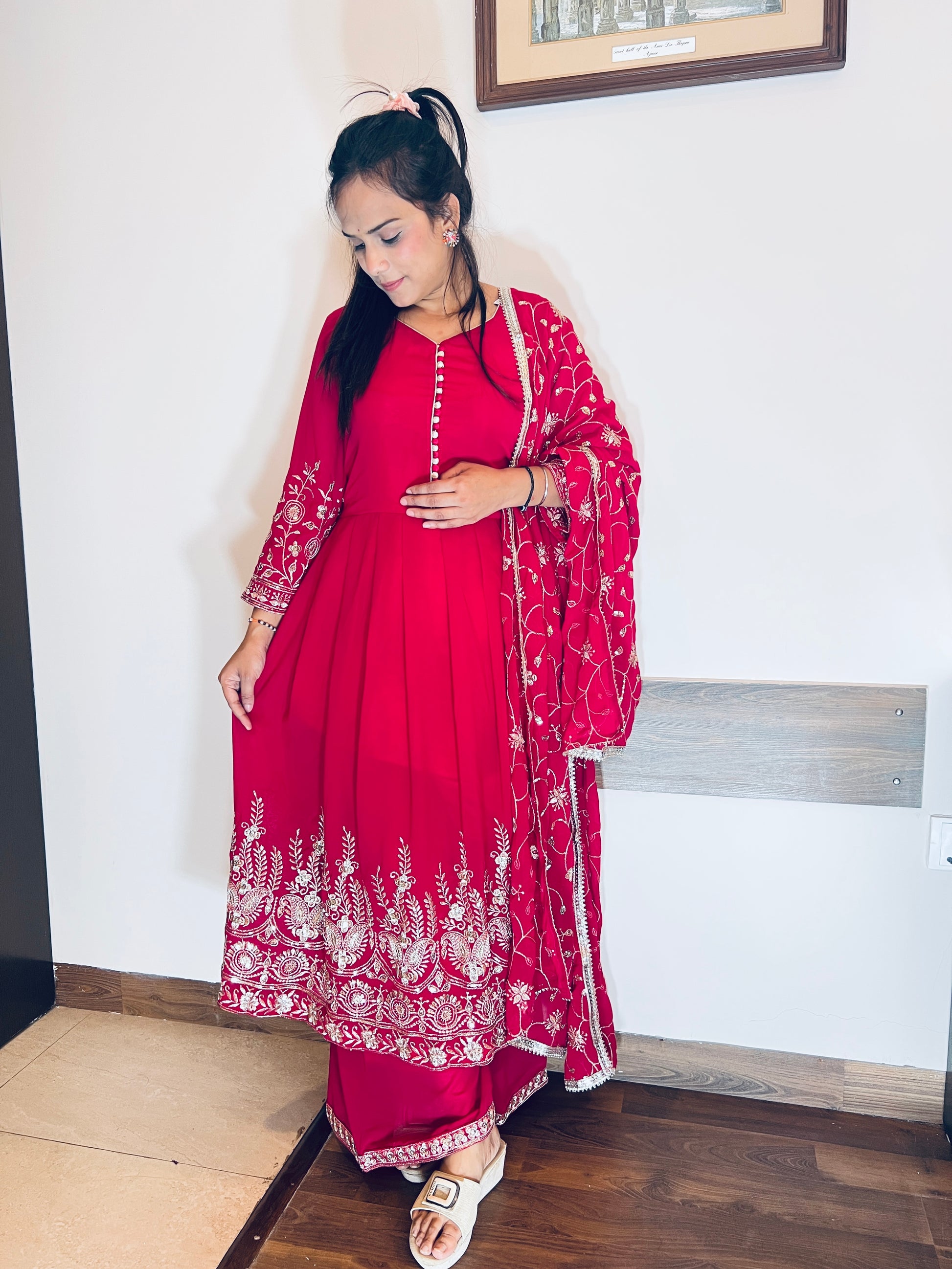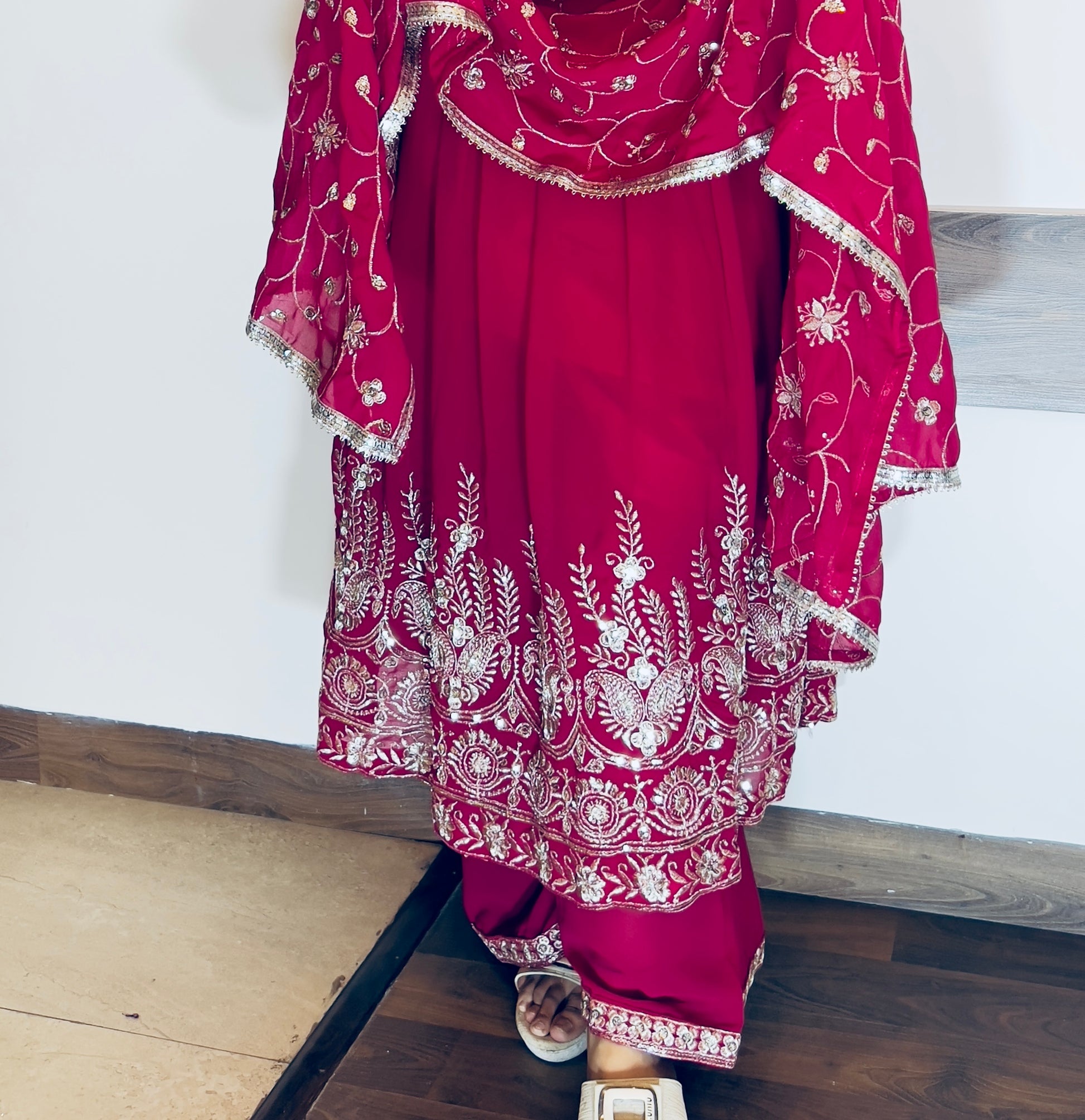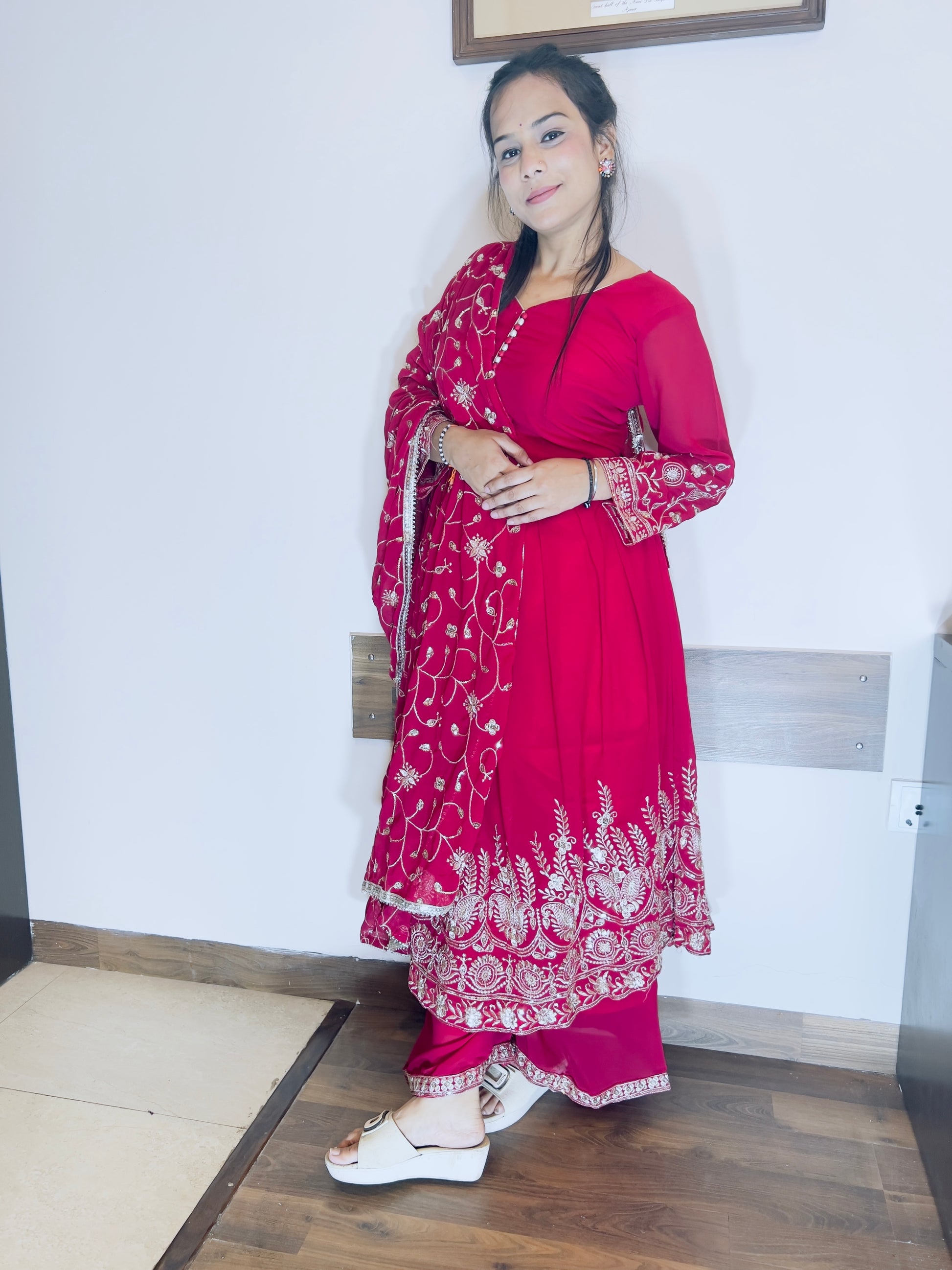 Turn heads at every celebration with this stunning Fronk Pink Party Wear Suit, crafted from premium georgette fabric that flows like a dream. The rich hue exudes festive charm, while the heavy dupatta adds a touch of royal grace. Perfect for weddings, receptions, or festive soirées — this outfit blends modern flair with timeless elegance, making you the center of every occasion.