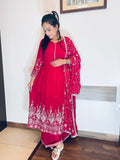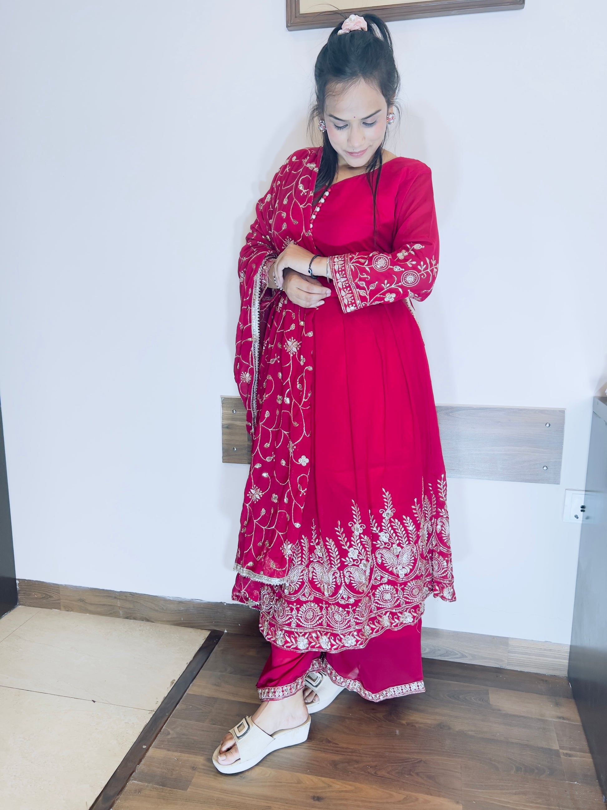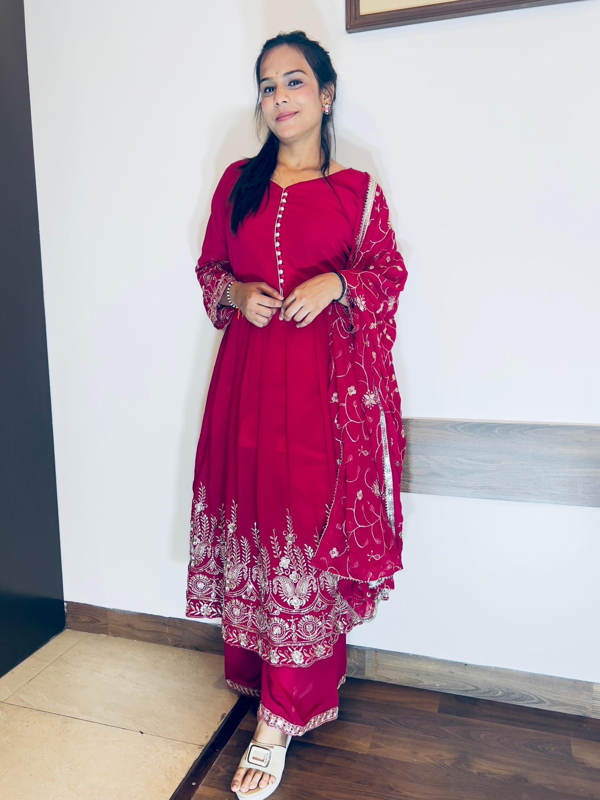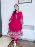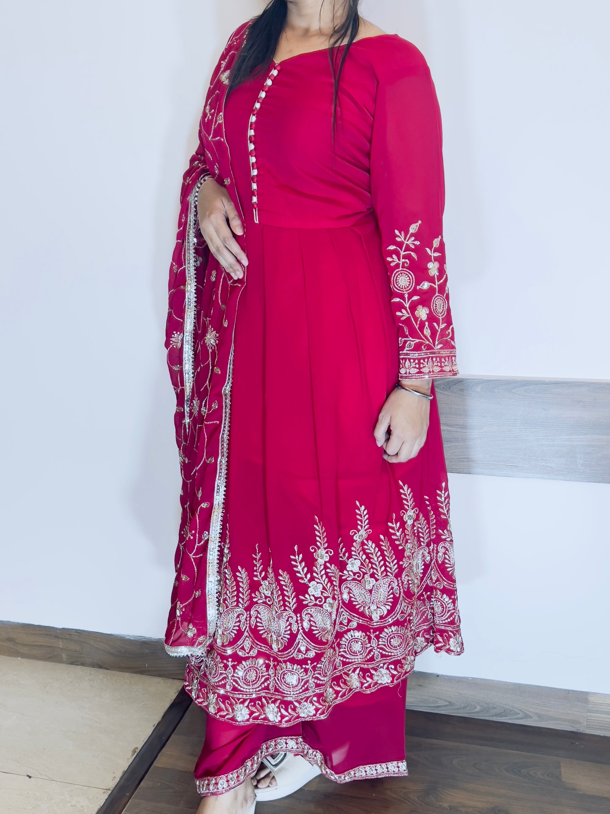 Turn heads at every celebration with this stunning Fronk Pink Party Wear Suit, crafted from premium georgette fabric that flows like a dream. The rich hue exudes festive charm, while the heavy dupatta adds a touch of royal grace. Perfect for weddings, receptions, or festive soirées — this outfit blends modern flair with timeless elegance, making you the center of every occasion.
